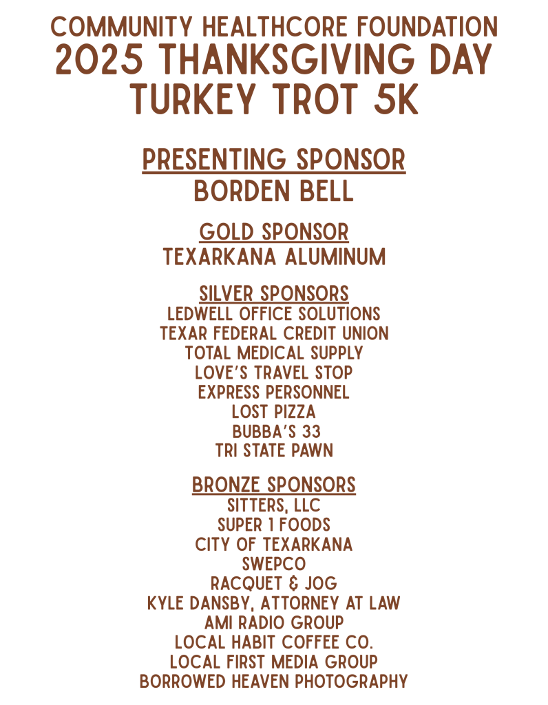 Two major fundraising events are held annually allowing the Foundation’s continued support to Community Healthcore. The Thanksgiving Day Turkey Trot 5K is held in Texarkana and Champions for Change in Longview. Other activities throughout the year include East Texas Giving Day and a Veteran’s Day luncheon.